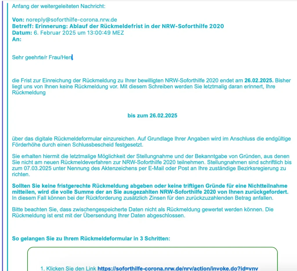 In den letzten Tagen haben viele Betroffene erneut eine sogenannte „letztmalige Erinnerung“ von ihrer Bezirksregierung erhalten mit dem Hinweis, bis spätestens 26. Februar 2025 den Verwendungsnachweis zur NRW-Soforthilfe einzureichen.